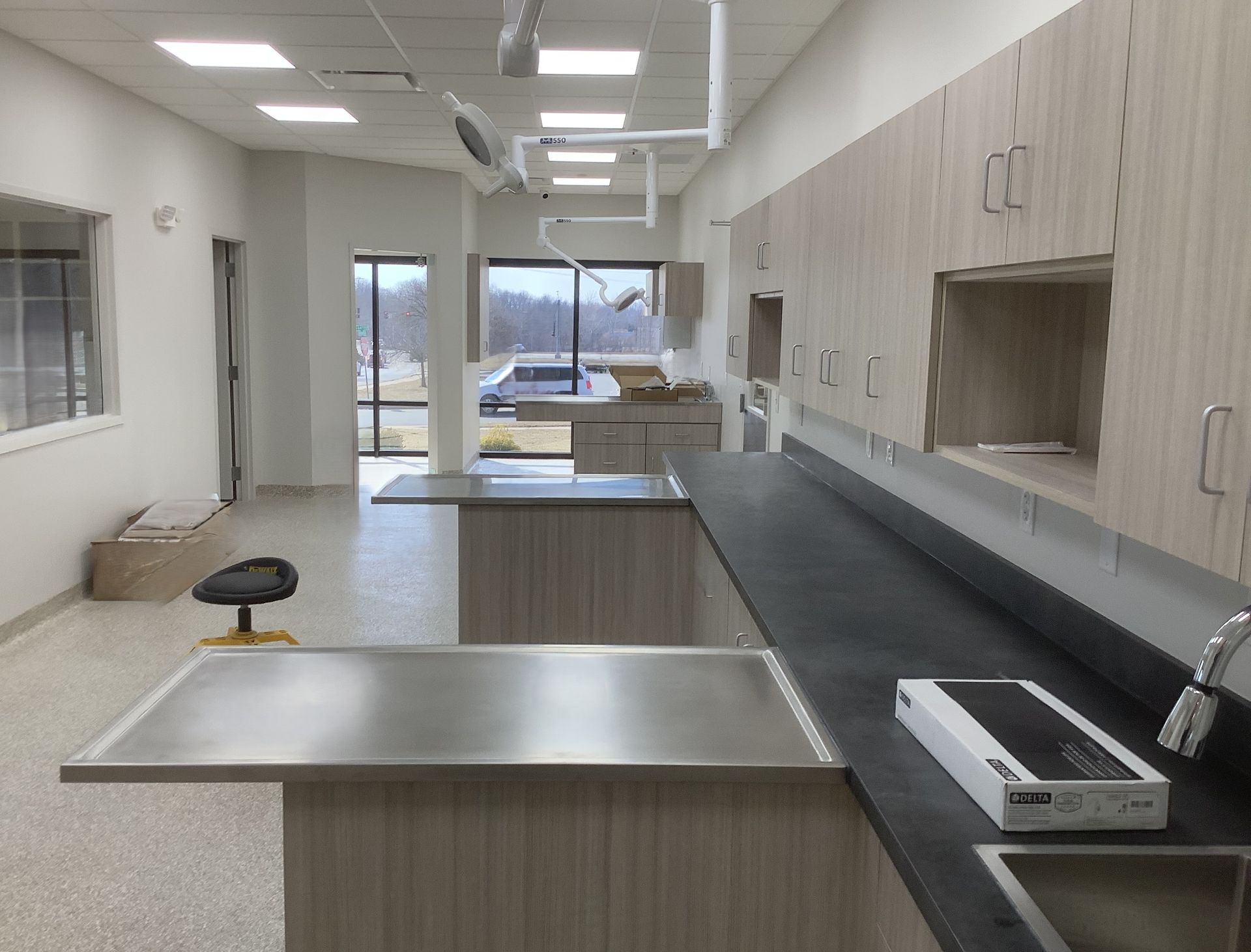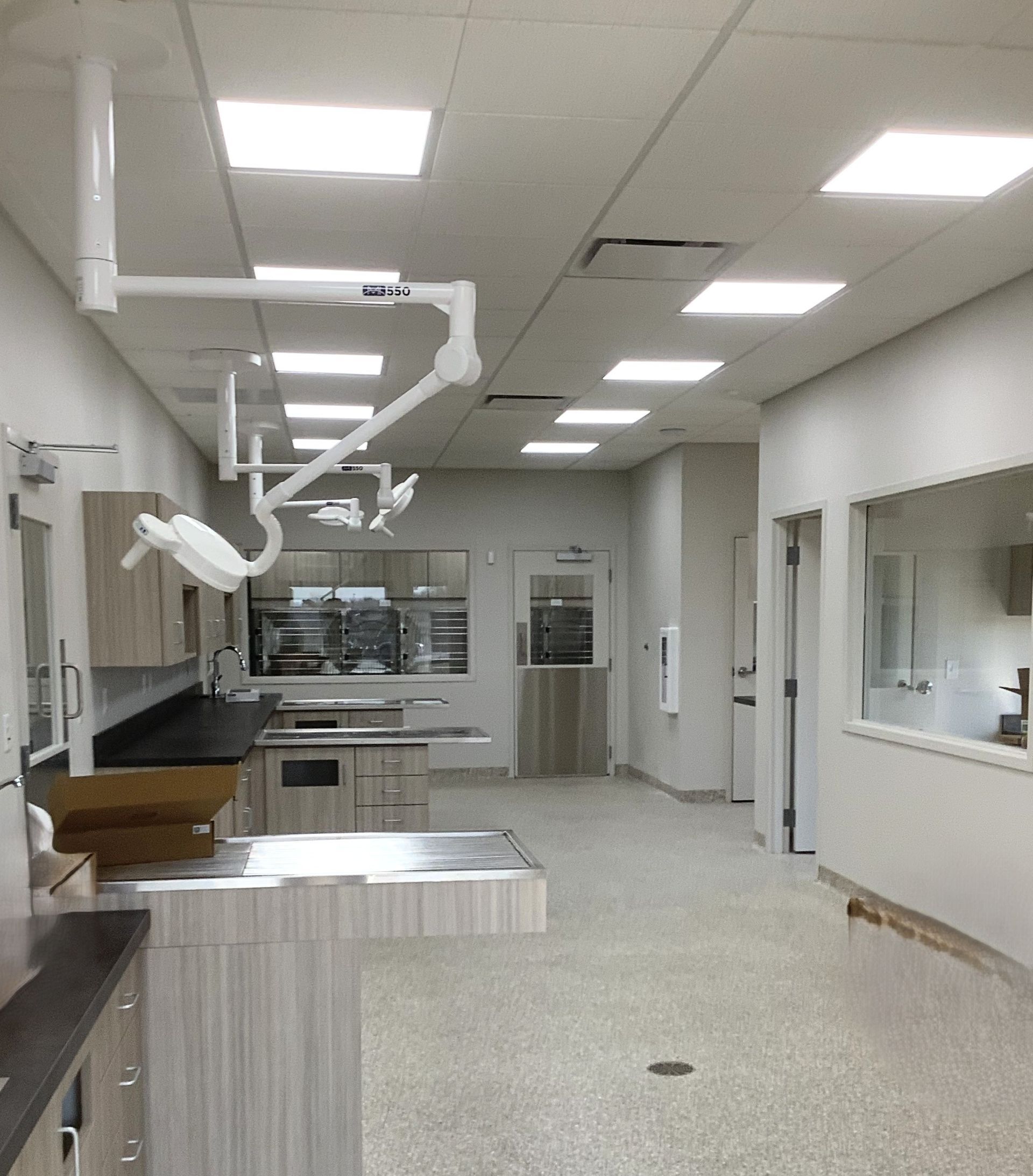 Converting a bank into a veterinary facility presents a distinct set of construction challenges — from reconfiguring vault and teller spaces into clinical rooms, to installing specialized systems including medical gas lines, plumbing, HVAC zoning, and surgical infrastructure where none previously existed. The existing drive-through lane was creatively retained and repurposed, giving the practice a convenient client amenity that sets it apart.